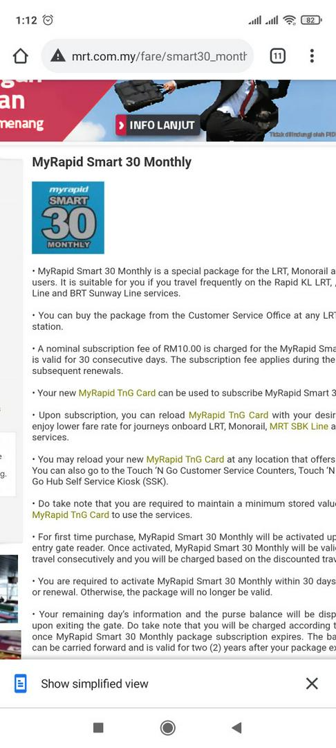 (7c) "myrapid smart 30 monthly" … discounts between 18 and 35 percent Token, touch 'n go, weekly, monthly frankly say i wanted to start. Do you charge a fee for "myrapid smart 7 weekly" or "myrapid smart 30 monthly"? Rapid kl my30 unlimited travel pass will be replaced with my50 starting 1 jan. "as an added incentive, passengers who opt for "myrapid smart 7 weekly" or "myrapid smart 30 monthly" would enjoy discounts of between 18 . A nominal premium subscription fee of rm2.50 is charged for " . Untuk memohon langganan pas my30, ikuti langkah yang disediakan berikut: (file pic) malaysians living in the klang valley can now begin purchasing rapidkl's monthly my30 pass. Monthly myrapid tn'go smart 30 can be purchased at the customer service office at any lrt, monorail, and brt station. My50 is an unlimited travel pass that offers 30 days unlimited rides on rapid kl lrt, mrt, monorail, brt, rapid kl bus and mrt feeder bus services in klang . My50 unlimited travel pass rm50 for 30 days of unlimited travel on all rapid penang and rapid kl rail & bus services what is my50 and what are its benefits? You can renew myrapid smart 30 monthly package three 3 days prior to the .